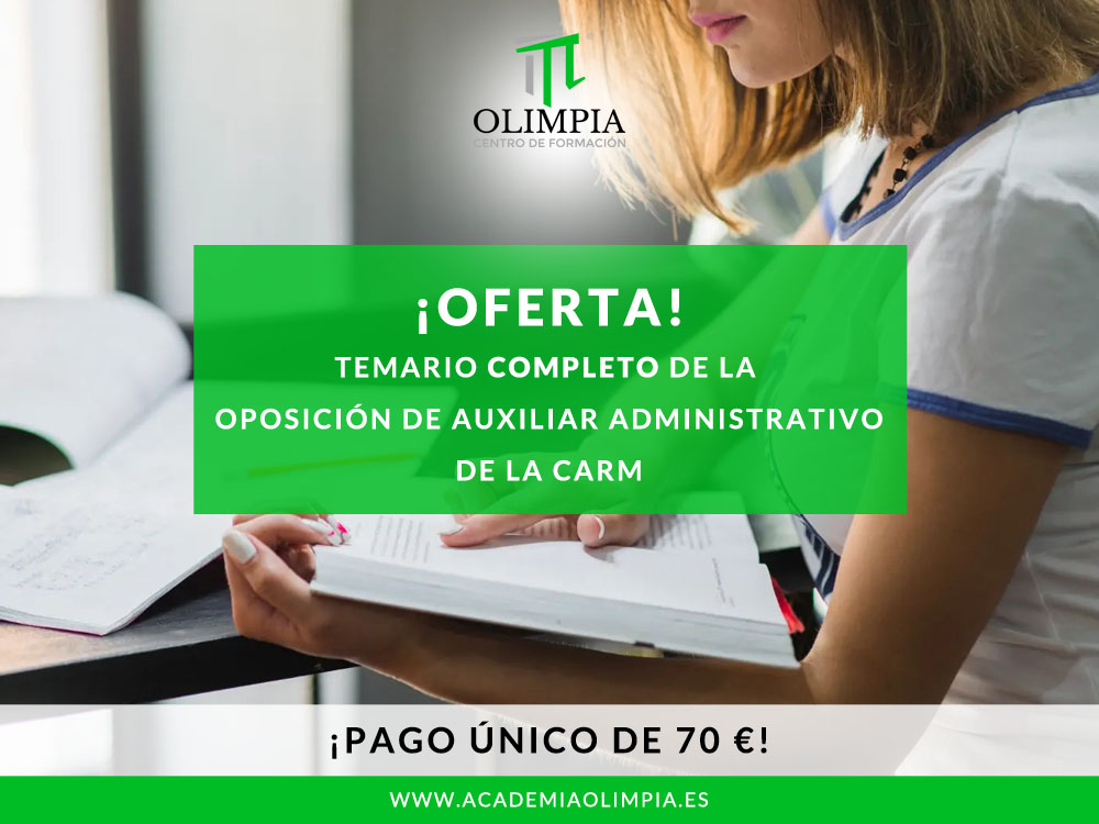 En ACADEMIA OLIMPIA ponemos a tu disposición un temario completo y actualizado para preparar la oposición de Auxiliar Administrativo de la CARM, diseñado para que estudies de manera efectiva y organizada.